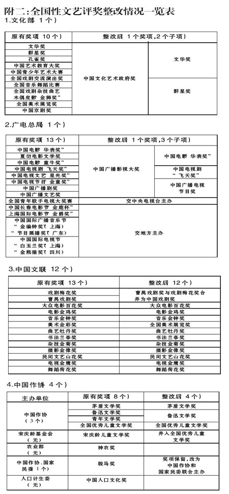 中國文聯現有全國性文藝評獎13個。整改后,將“戲劇梅花獎”、“曹禺戲劇獎”合并為“中國戲劇獎”,“大眾電影百花獎”、“電影金雞獎”、“音樂金鐘獎”、“美術金彩獎”、“曲藝牡丹獎”、“書法蘭亭獎”、“雜技金菊獎”、“攝影金像獎”、“民間文藝山花獎”、“電視金鷹獎”、“舞蹈荷花獎”等11個獎項保留,減少1個,減至12個。“美術金彩獎”更名為“全國美術展覽獎”。評選工作兩年一次。