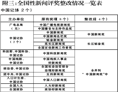 原有全國性新聞評獎14個,廣播電影電視總局主辦的2個,中華全國新聞工作者協會獨立主辦的5個,全國人大、全國政協各1個,其他部委和中華全國新聞工作者協會聯合主辦的5個。整改后,減至2個,減少12個。