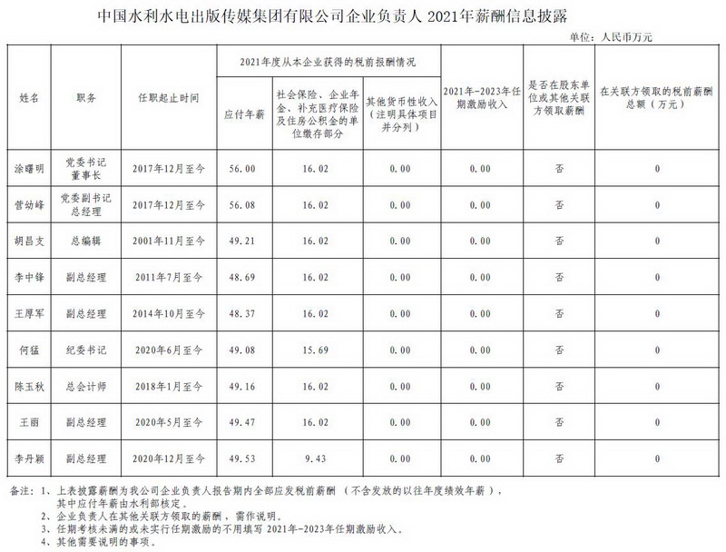 水電知識(shí)網(wǎng)»資訊»出版?zhèn)髅劫Y訊»中國(guó)水利水電出版?zhèn)髅郊瘓F(tuán)有限公司企業(yè)負(fù)責(zé)人2021年薪酬信息披露