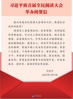 新華社北京4月23日電 首屆全民閱讀大會23日在京開幕。中共中央總書記、國家主席、中央軍委主席習(xí)近平發(fā)來賀信,表示熱烈的祝賀。 習(xí)近平在賀信中指出,閱讀是人類獲